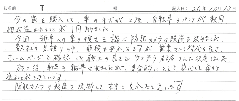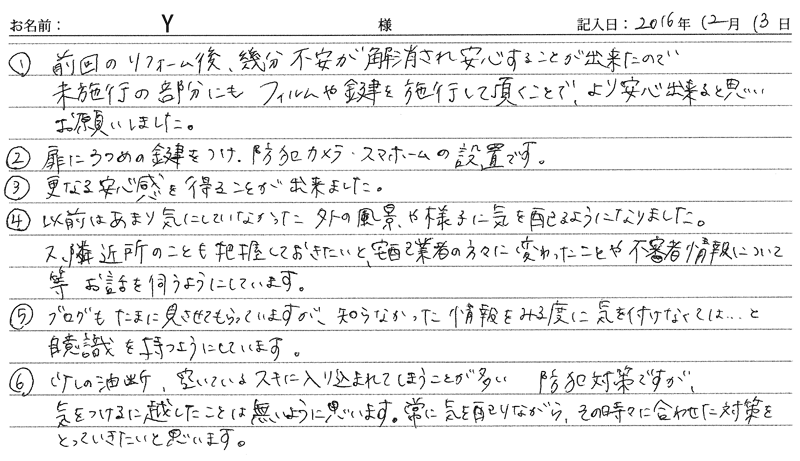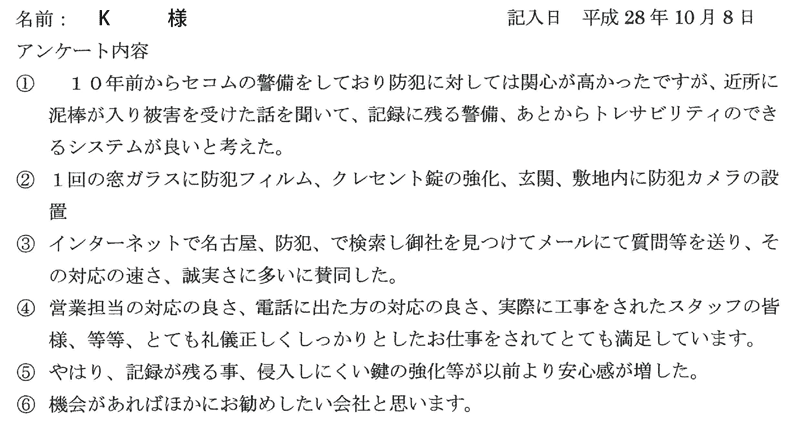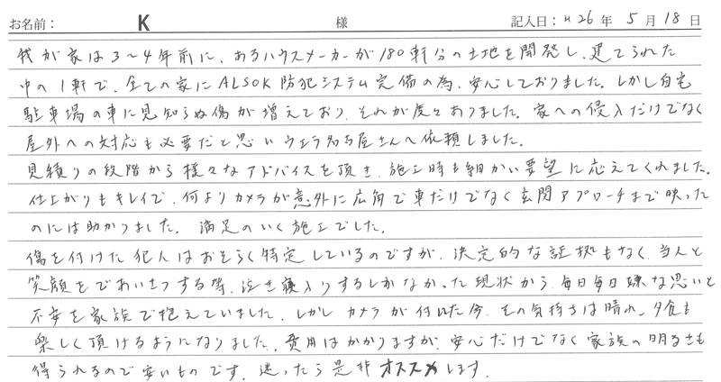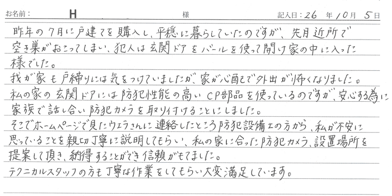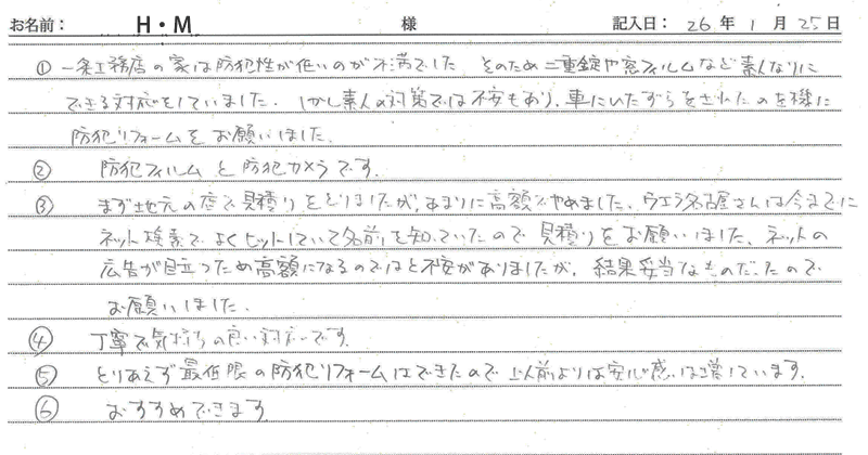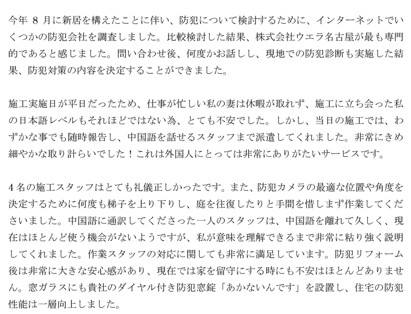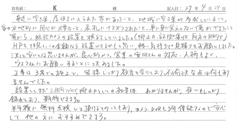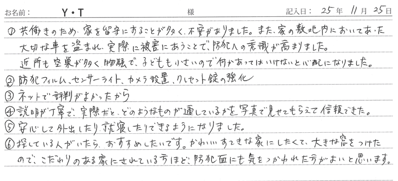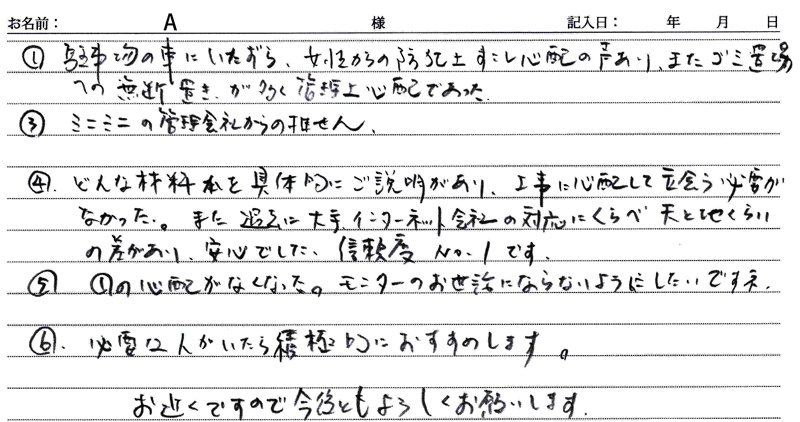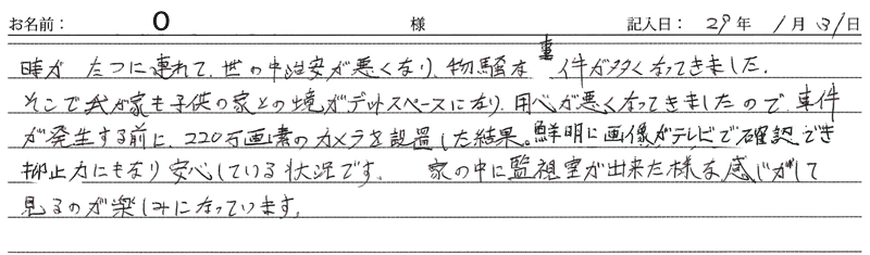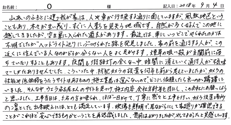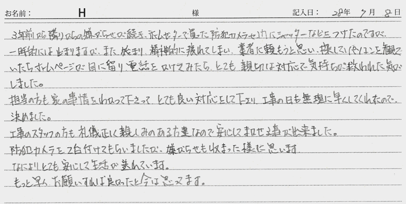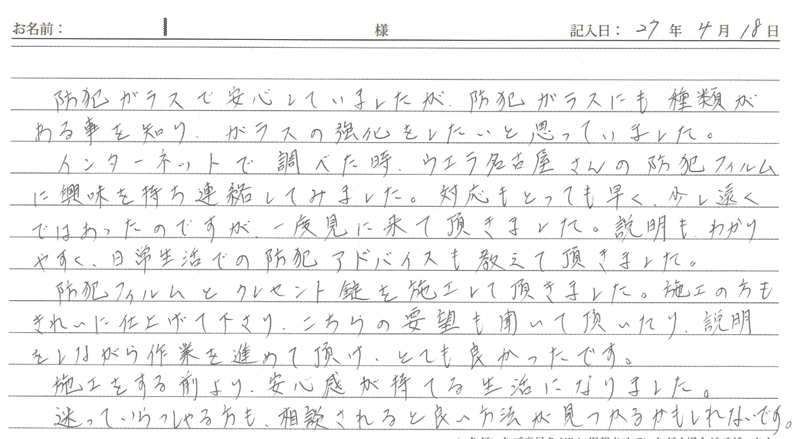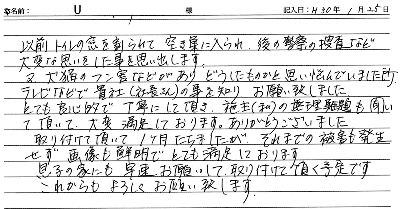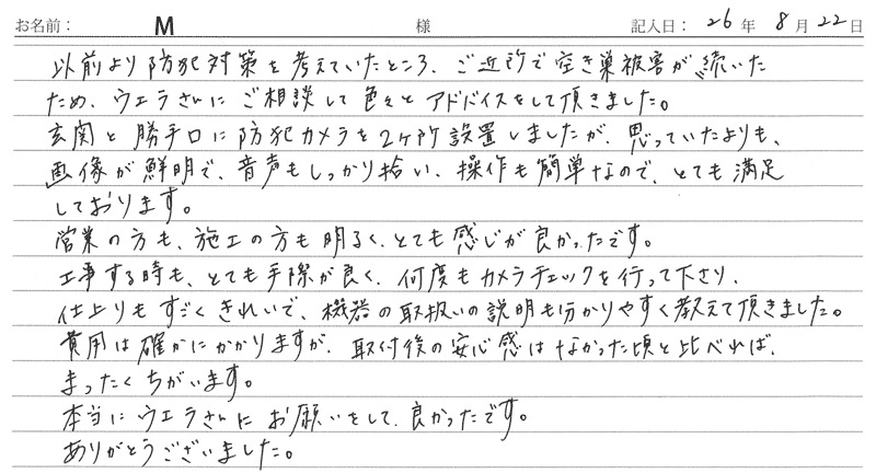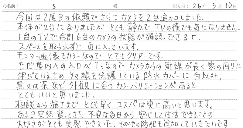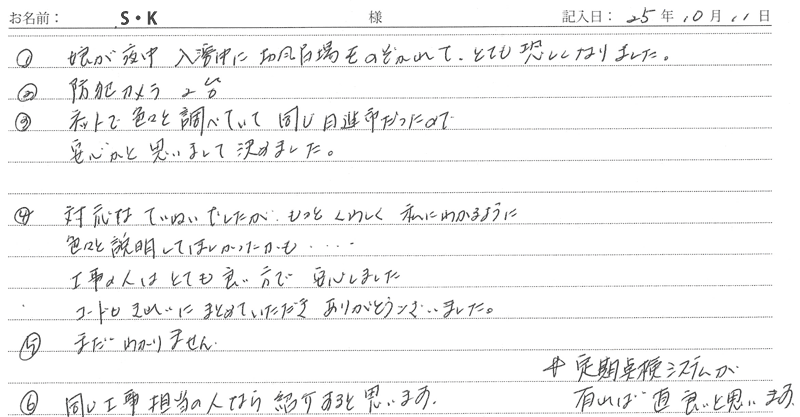 ※これまでに、一般家庭を含め施工させて頂いた中で、ご返信頂きましたお客様の声をご紹介します。